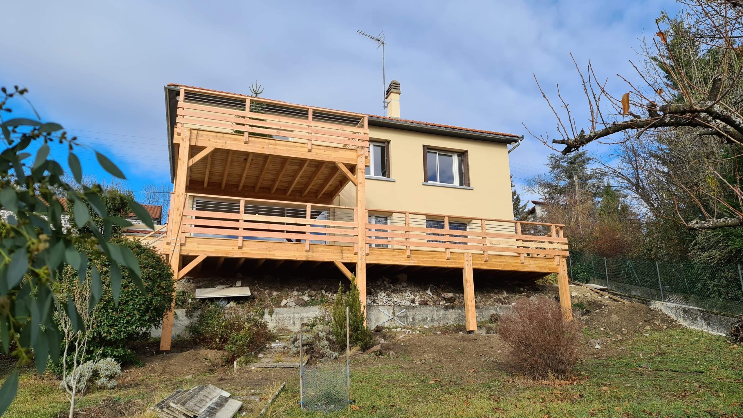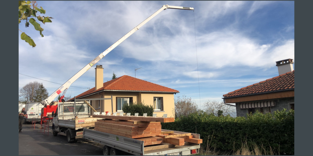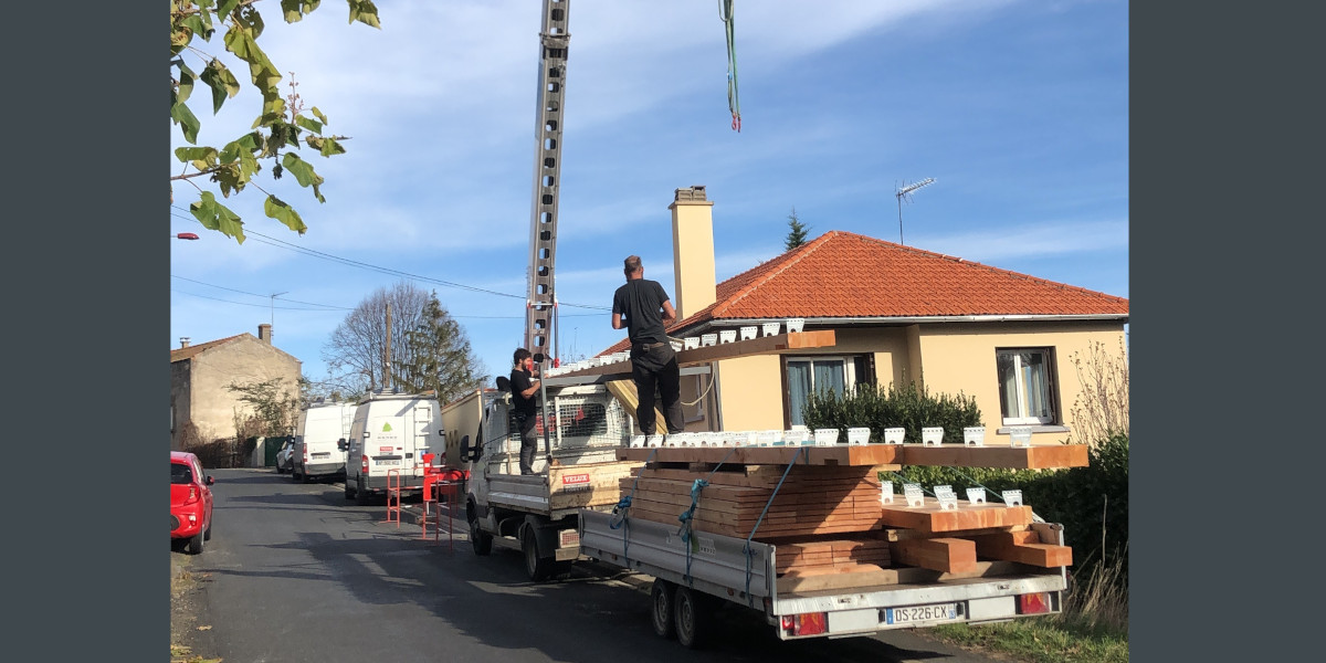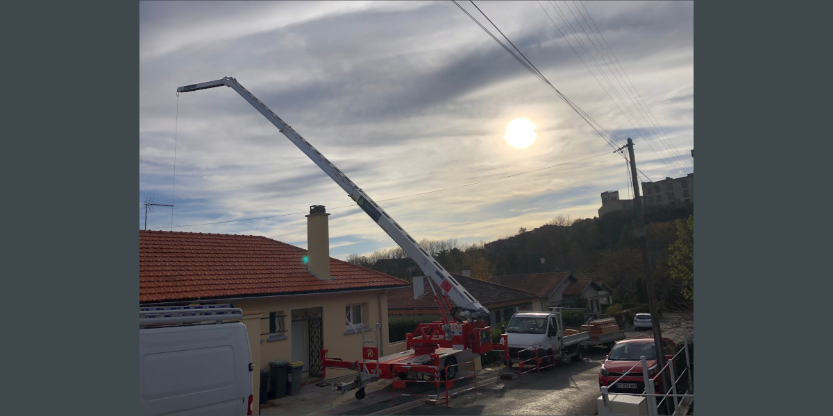 Mise en place de la grue, dans la rue, tous les bois sont passé au dessus de l’habitation.
