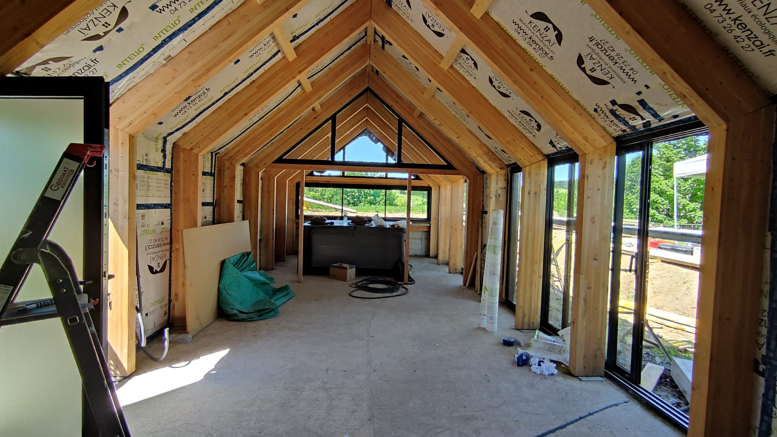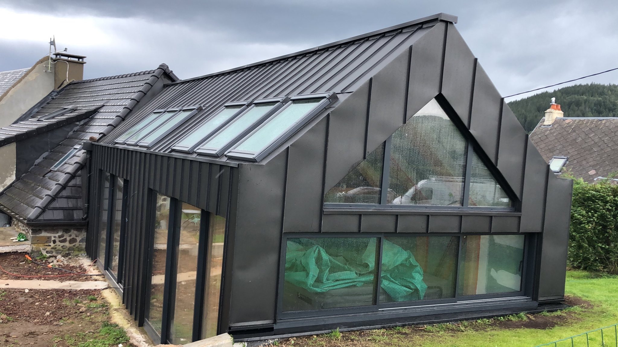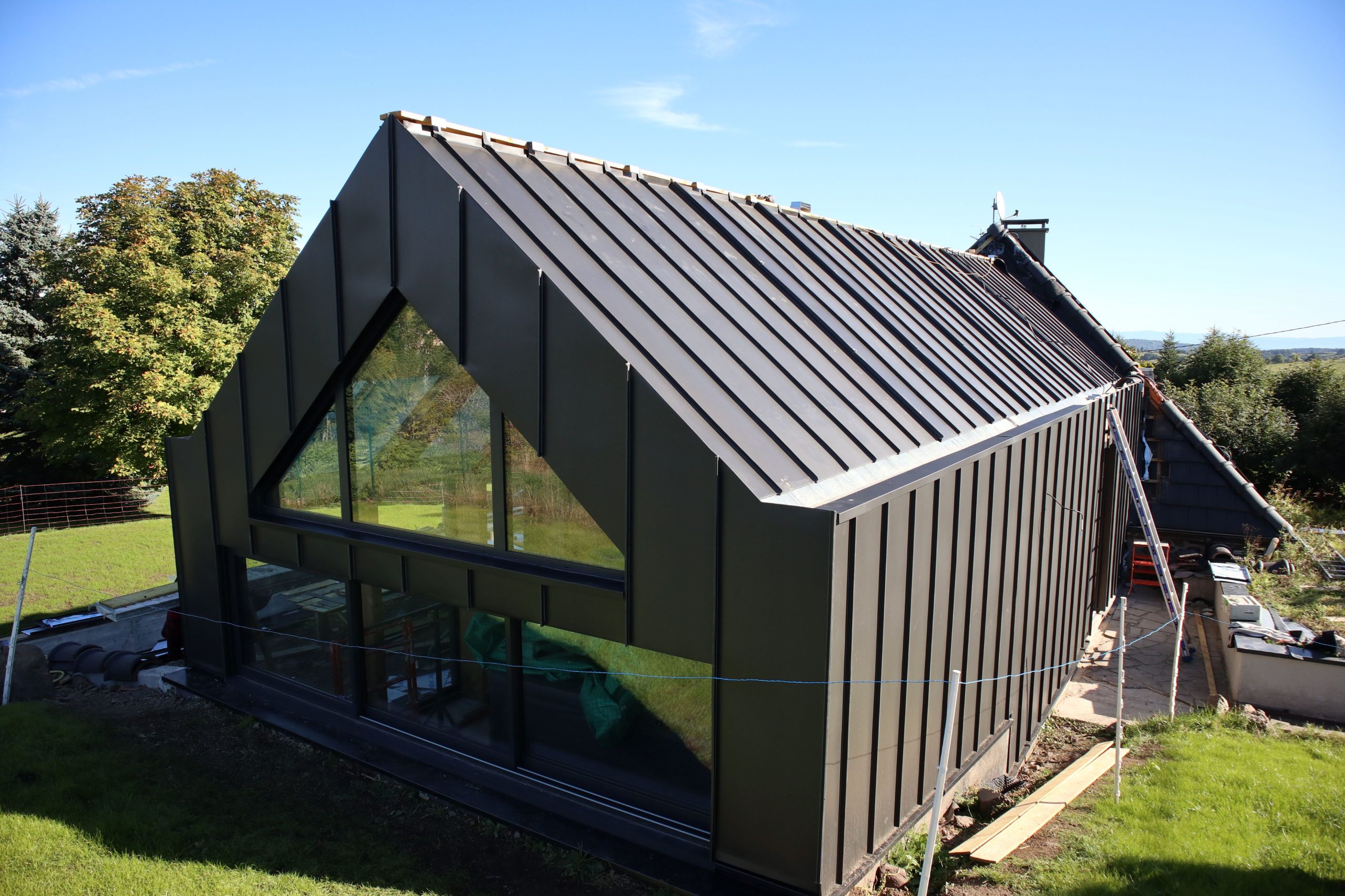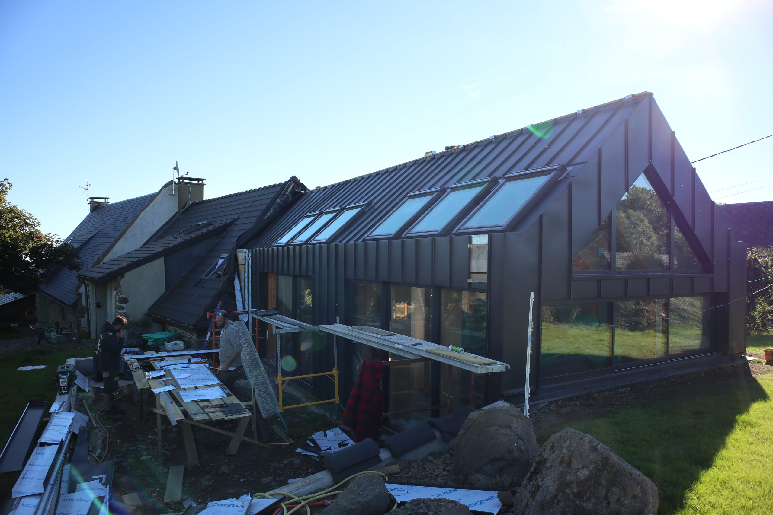 Création d’une extension en portiques lamellé collé dans le style Barnhouse. La plupart des éléments de charpente ont été réalisé en atelier. Tous les assemblages sont masqués L’extension est en zinc à joints debout anthracite
