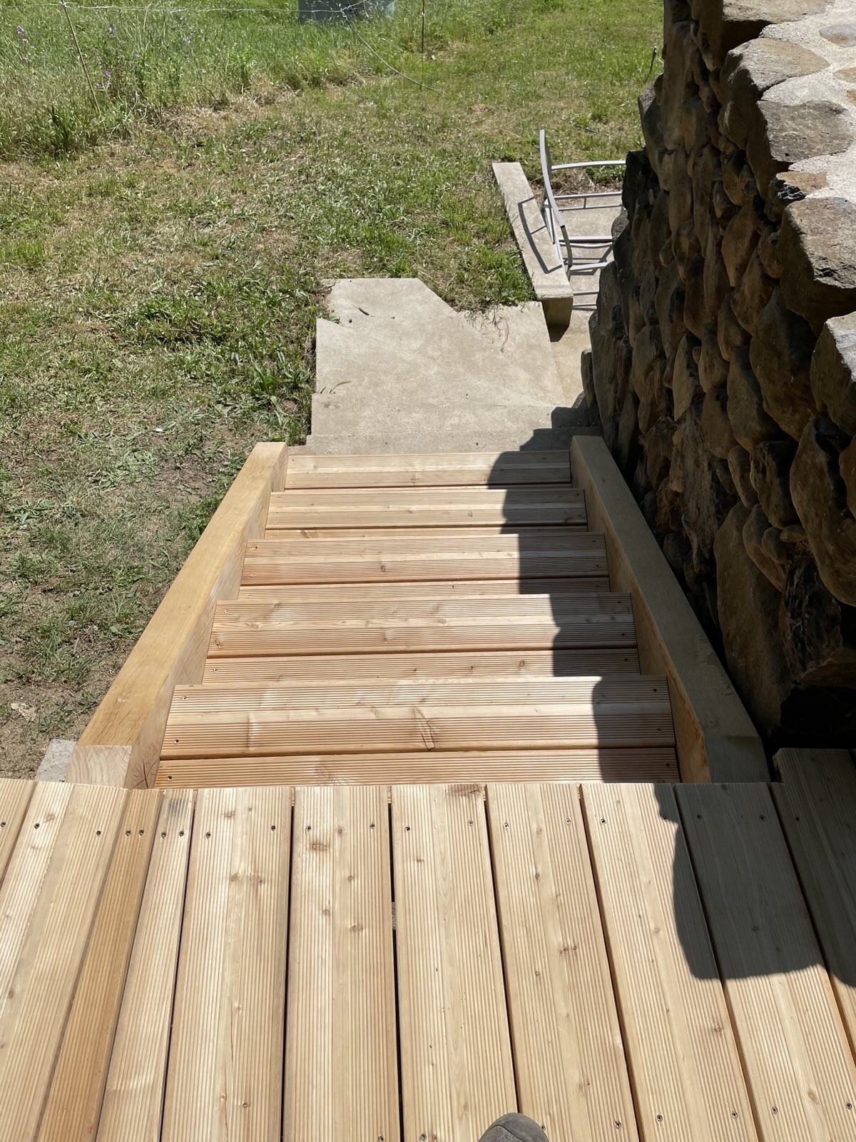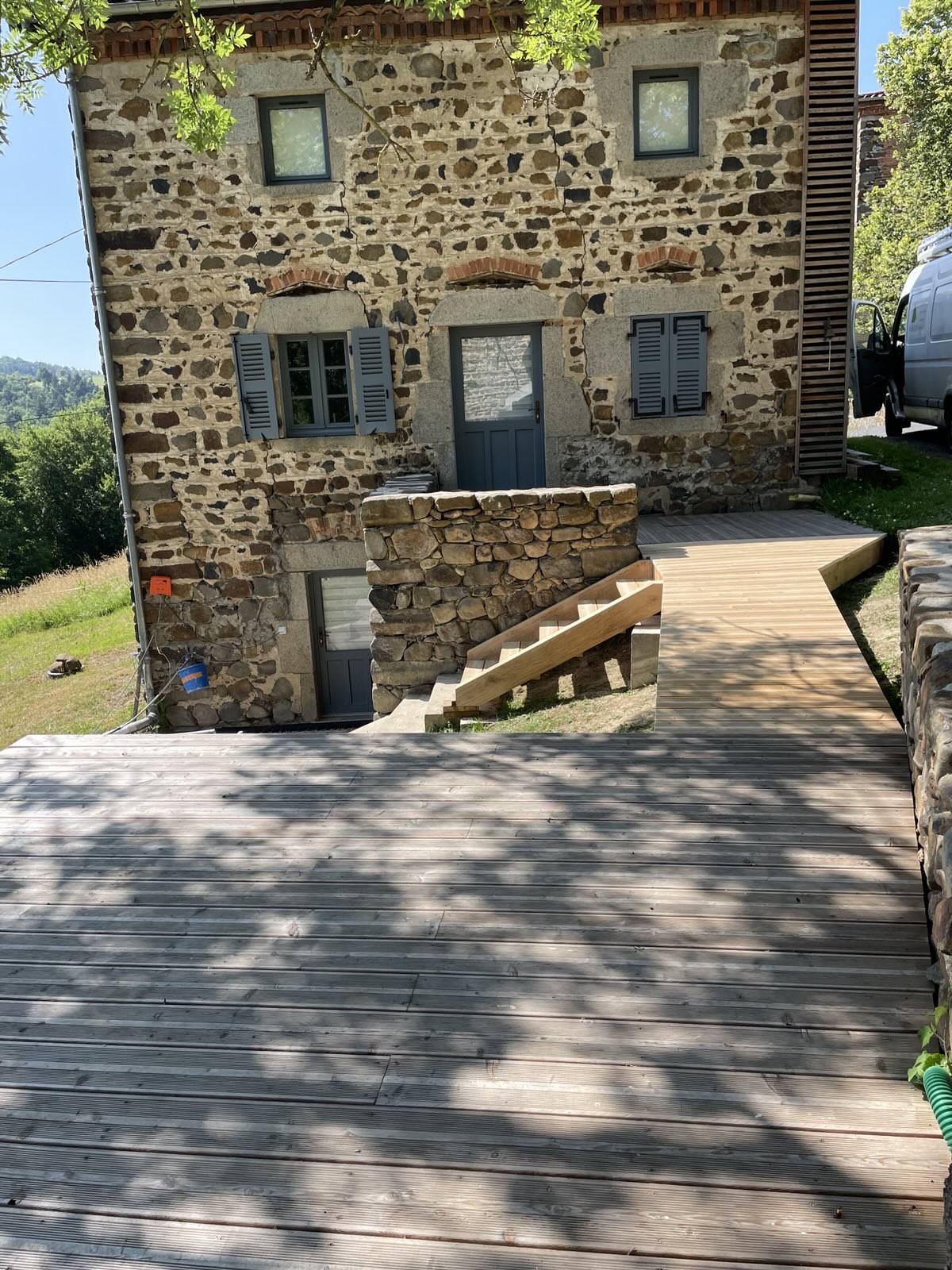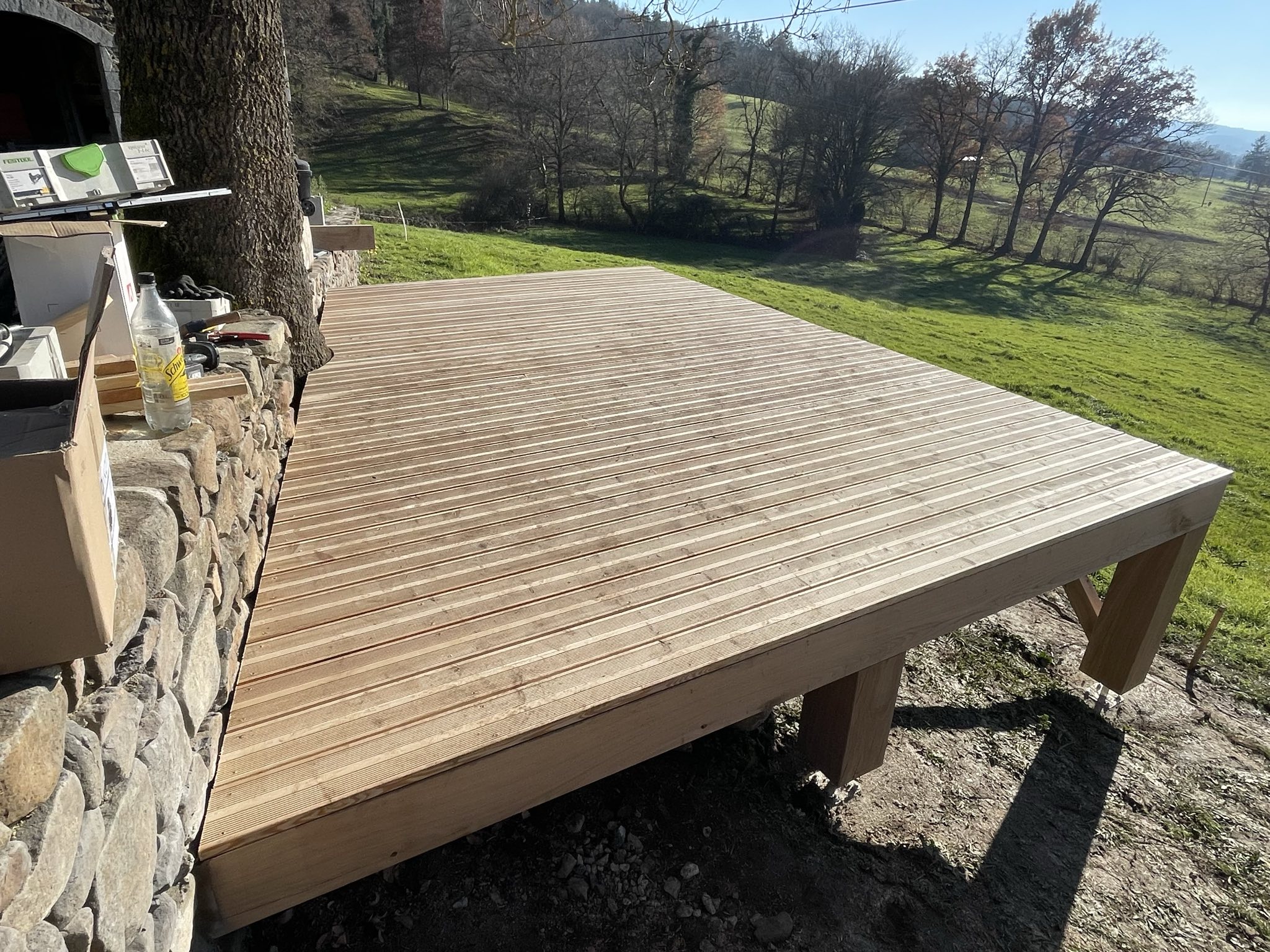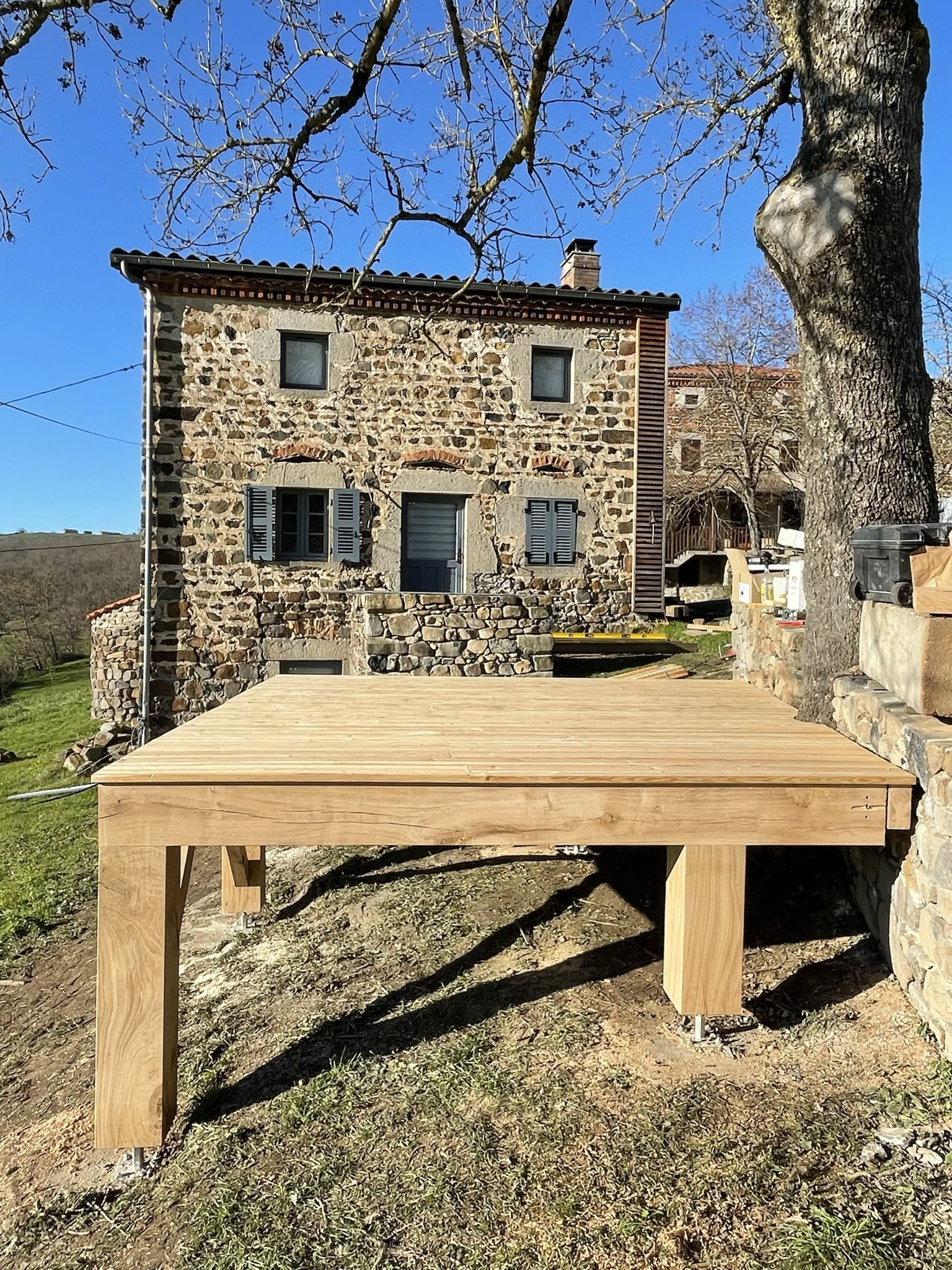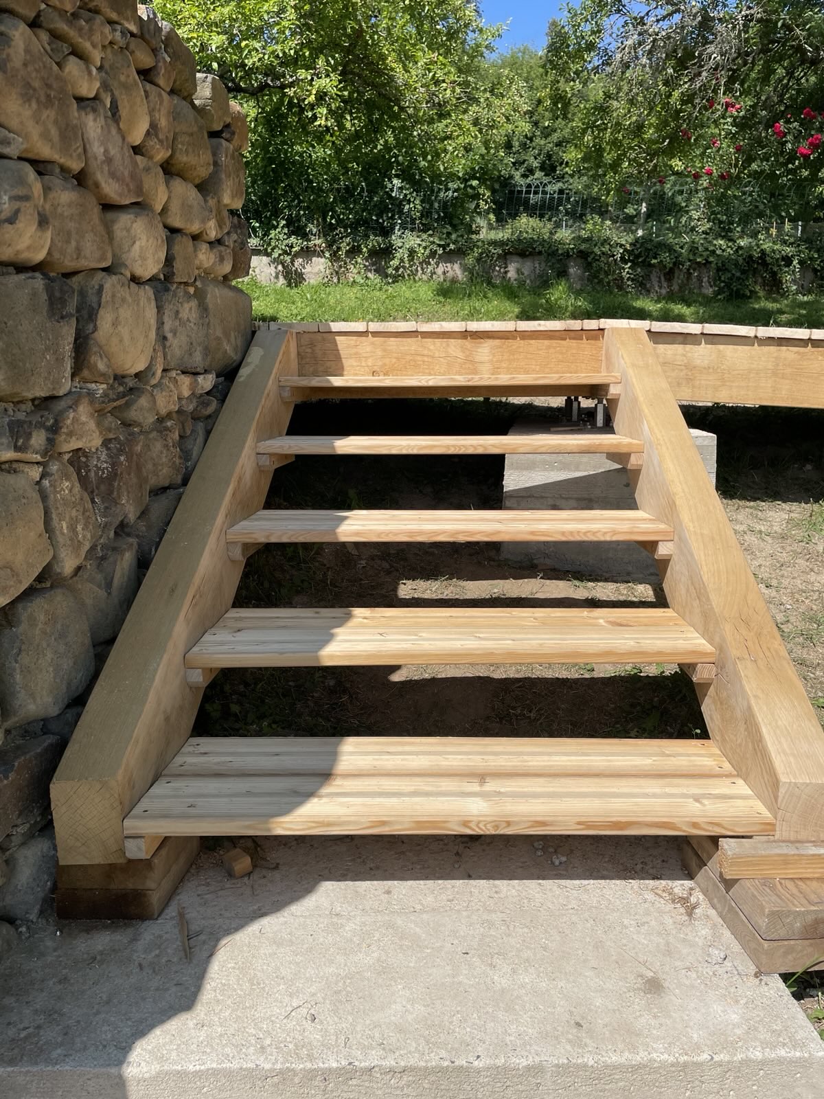 Réalisation d’une terrasse en acier thermolaqué avec un platelage bois. Les plans ont été réalisés en interne et confiés à un serrurier. Les lames de terrasse sont en Frêne rétifié(thermo chauffé). L’habillage sous la terrasse est en Ethernit. Marches en Chêne. Prêt pour la fin de l’année et vivement l’été prochain !
