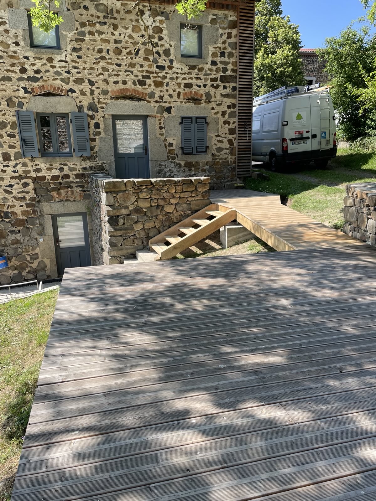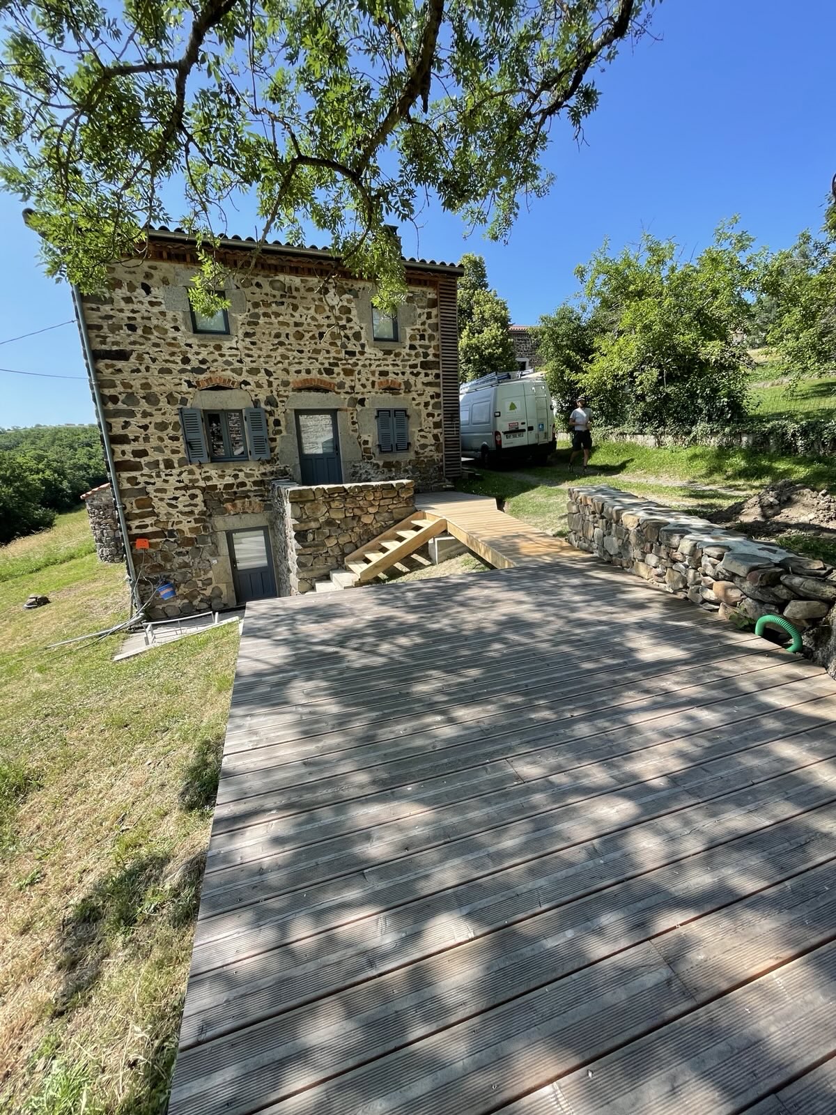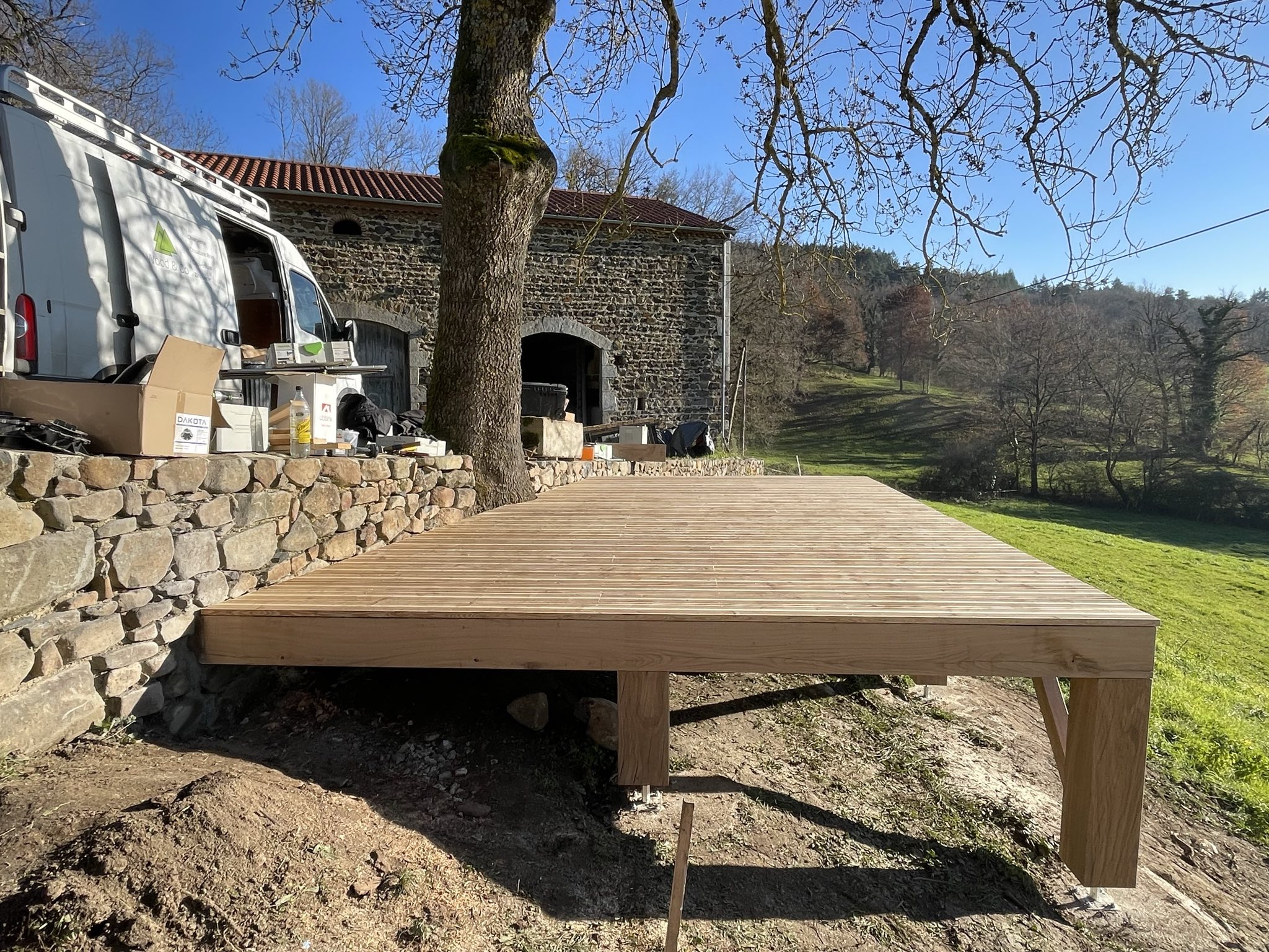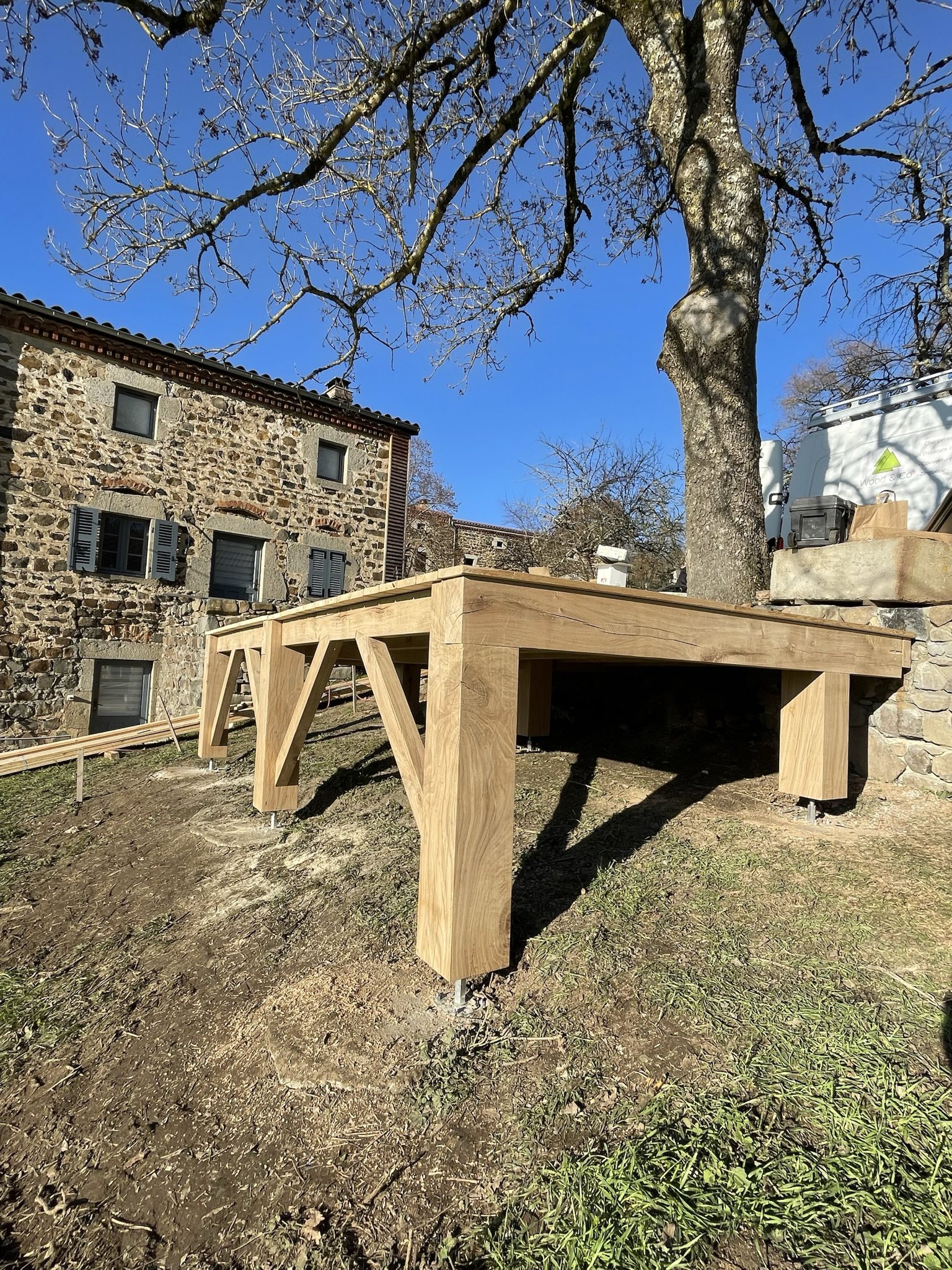 Réalisation d’une terrasse en acier thermolaqué avec un platelage bois. Les plans ont été réalisés en interne et confiés à un serrurier. Les lames de terrasse sont en Frêne rétifié(thermo chauffé). L’habillage sous la terrasse est en Ethernit. Marches en Chêne. Prêt pour la fin de l’année et vivement l’été prochain !
