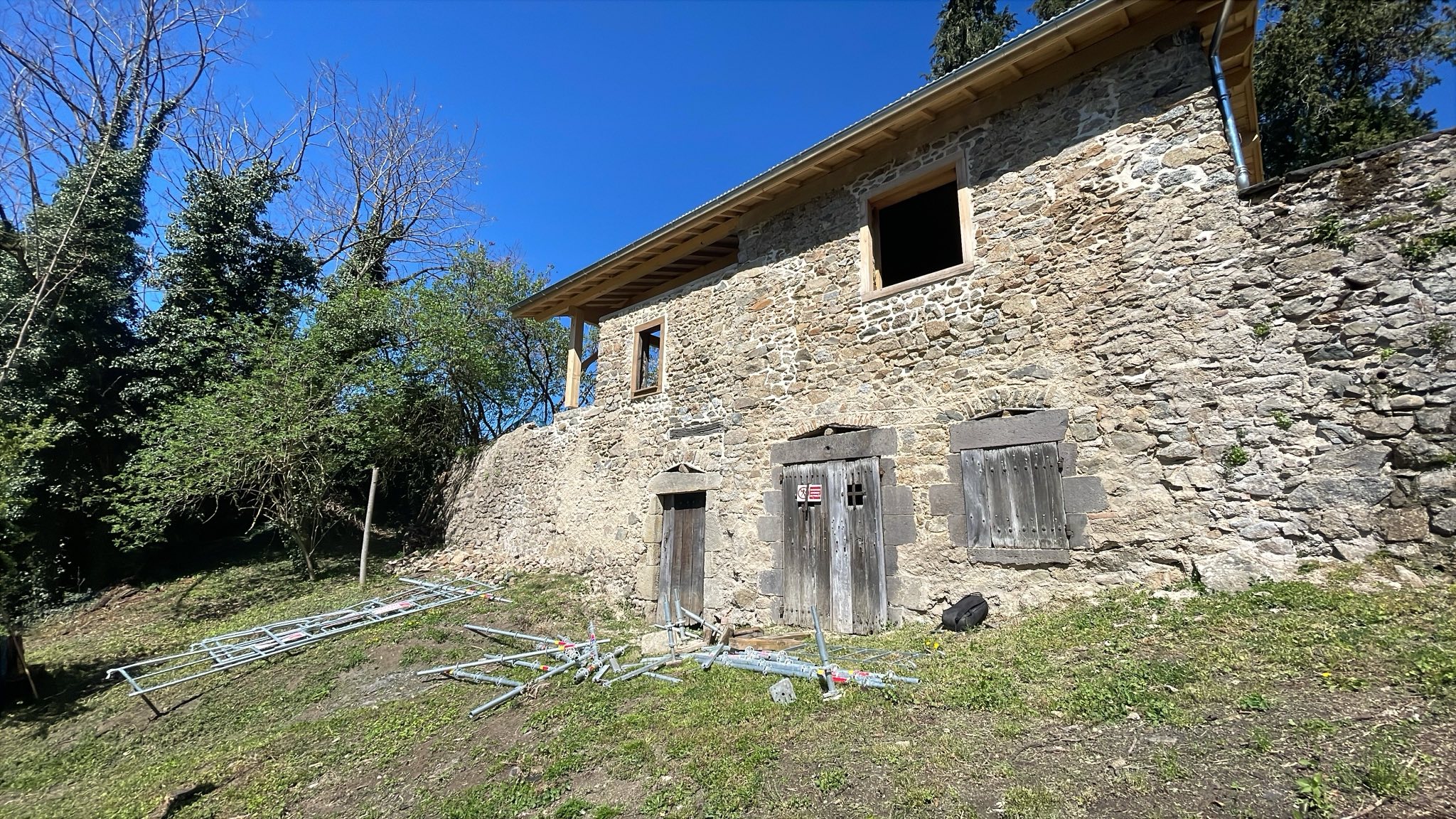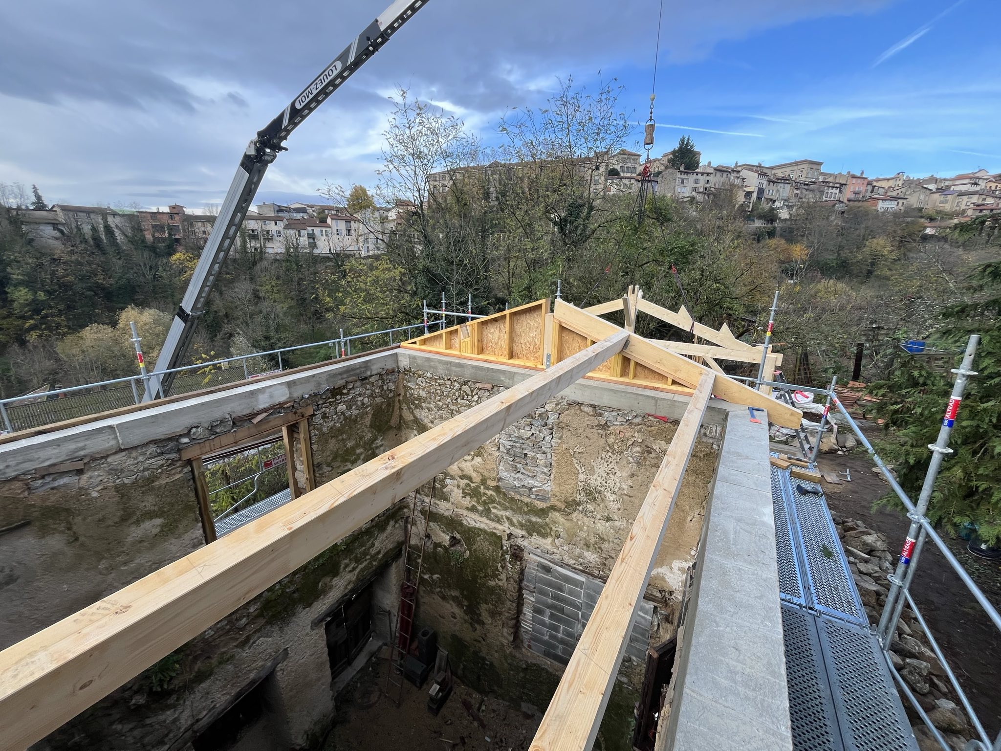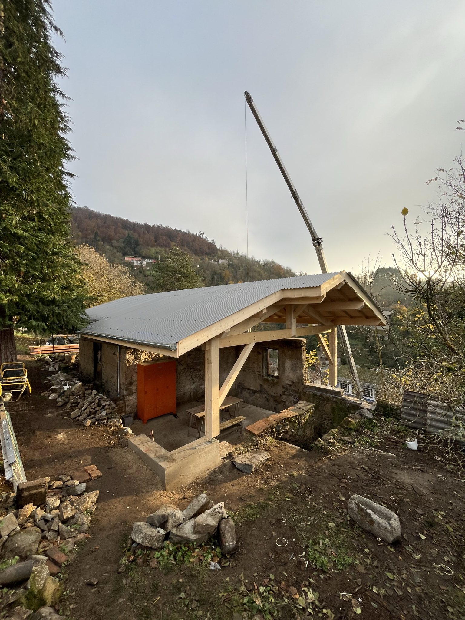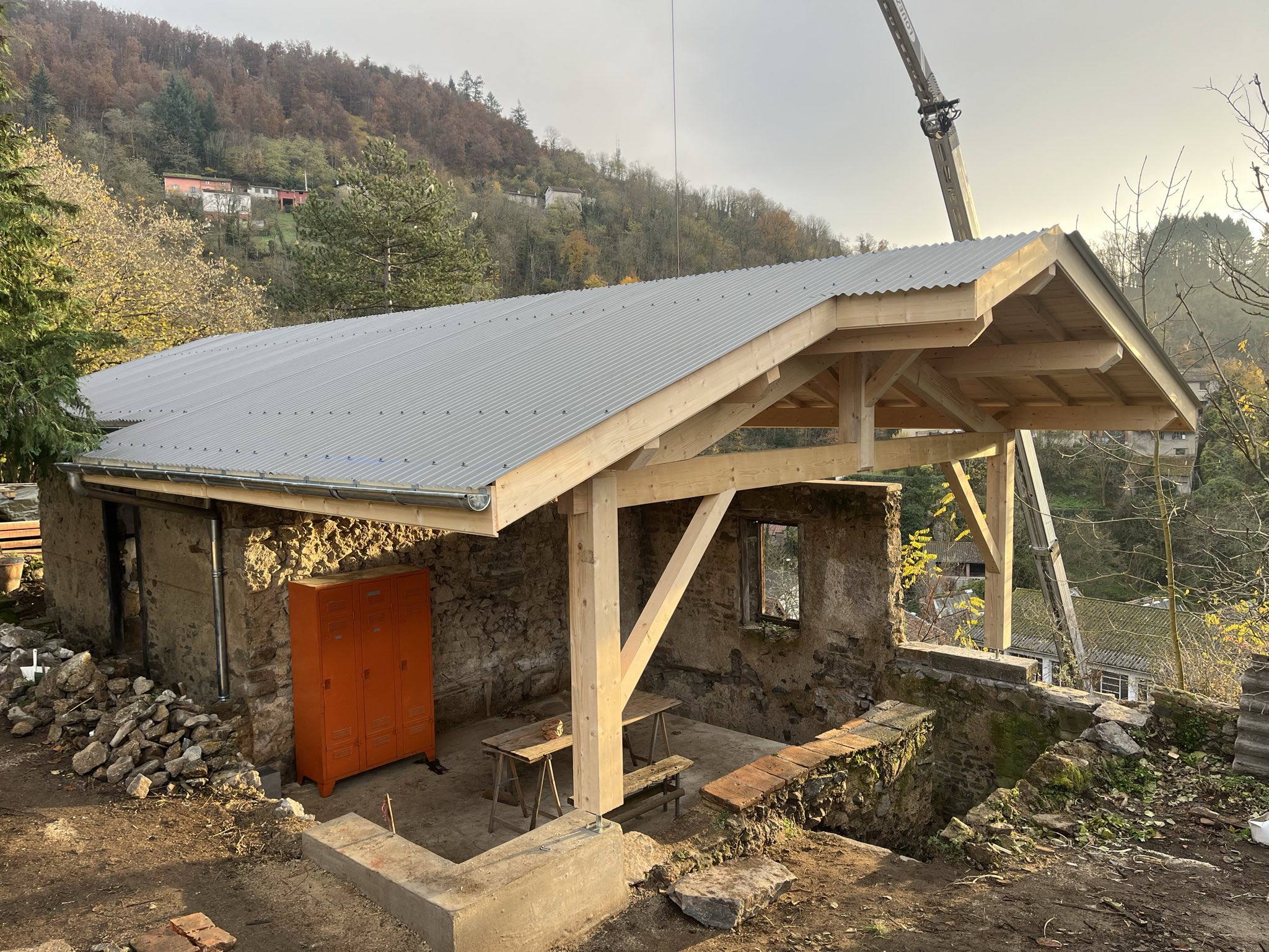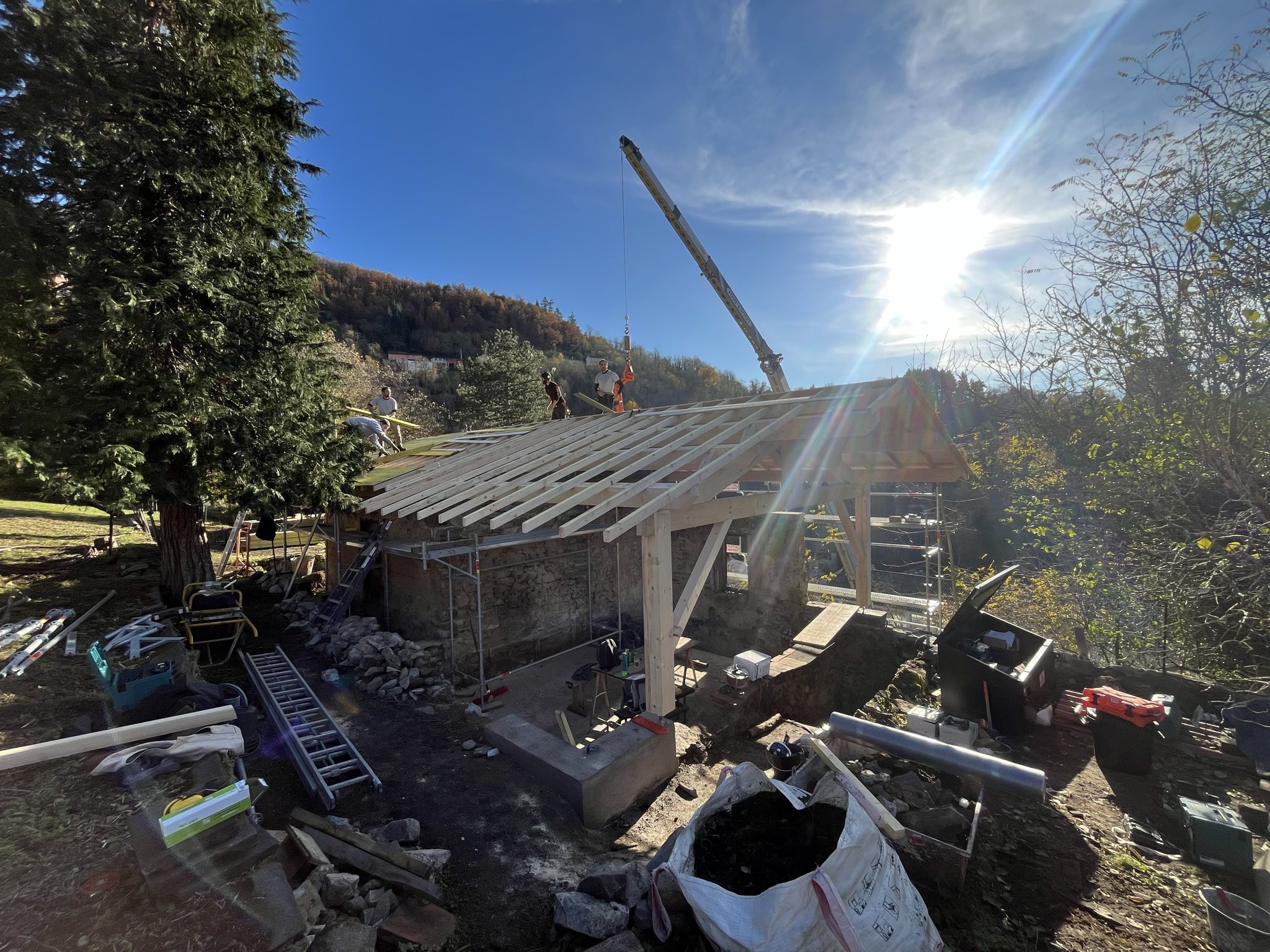Réfection de la charpente et de la couverture de cette ancienne en pierres. La suppression des fermes pour faire place à des Lamellés collés cintré a été décidé par nous et le client, afin d’avoir une meilleur hauteur de passage sur les planchers de l’étage. Et puis, quand même, c’est sacrément beau ! Finition avec une couverture acier des deux partie en translucide en guise de puits de lumière.