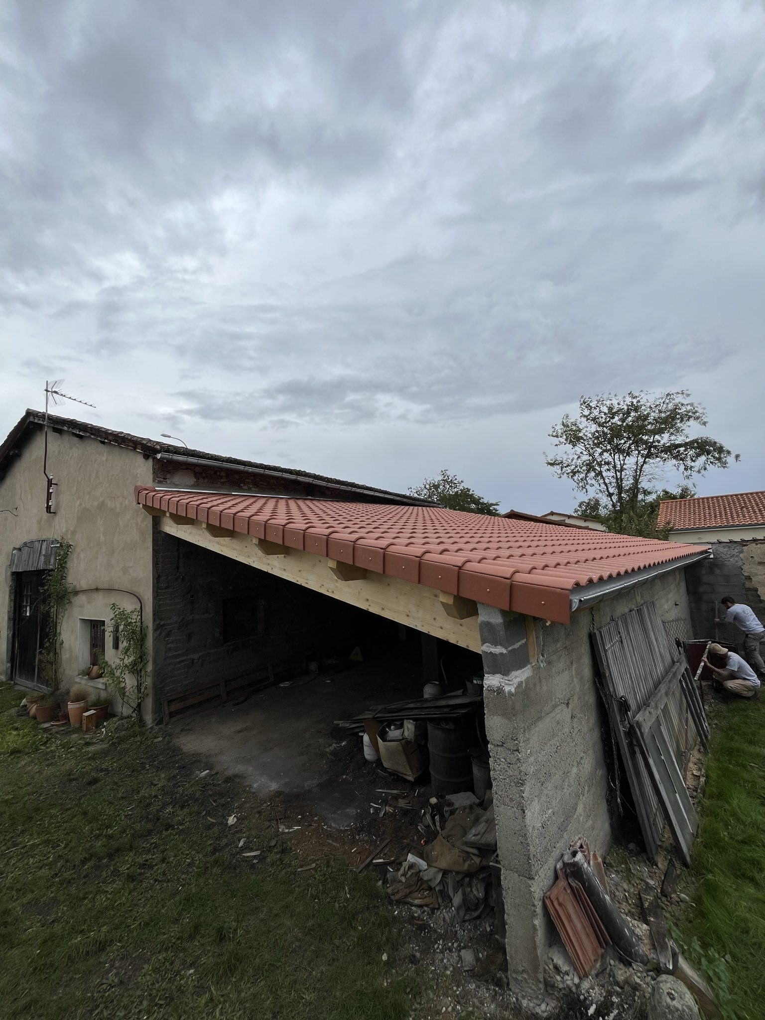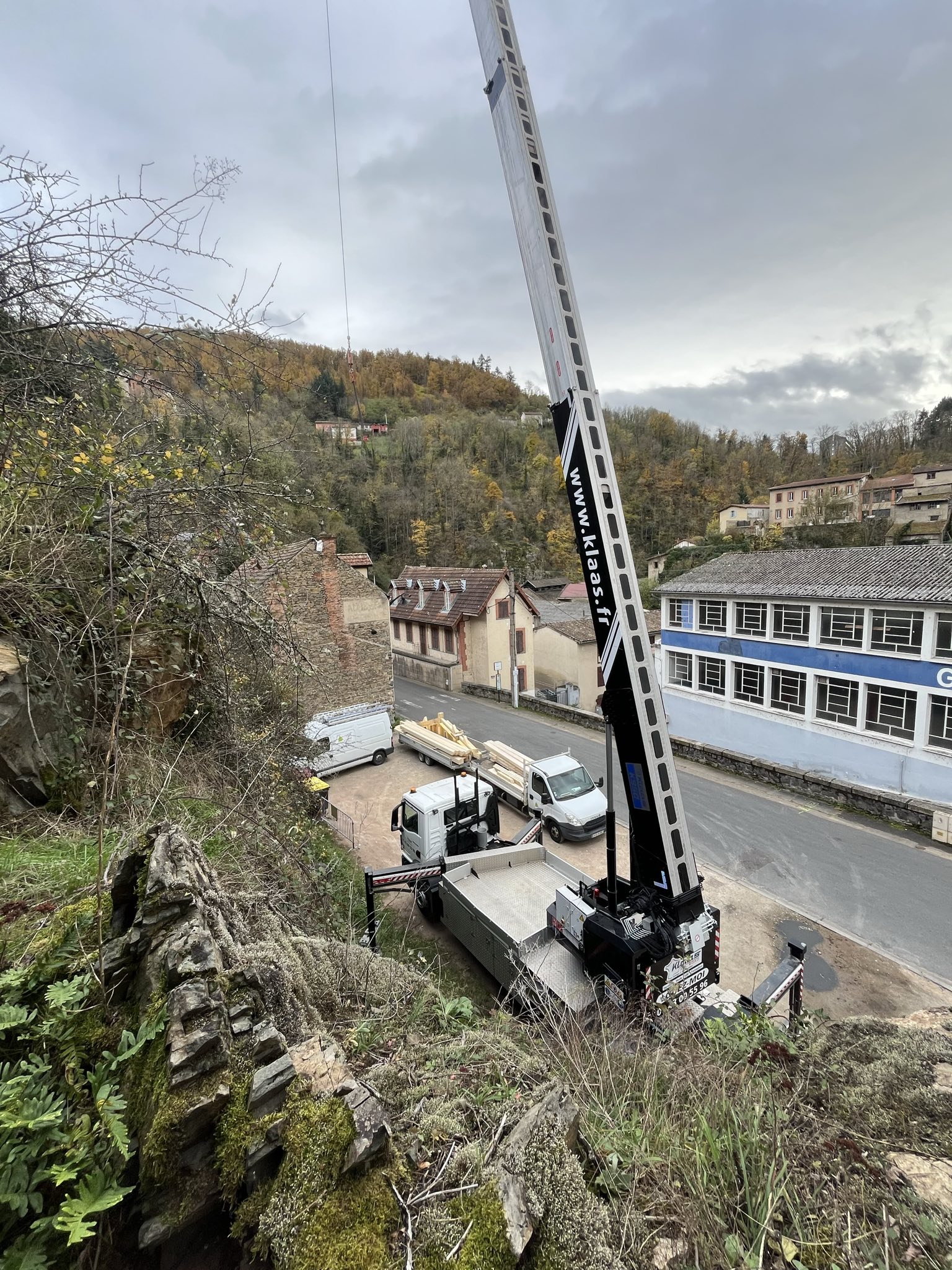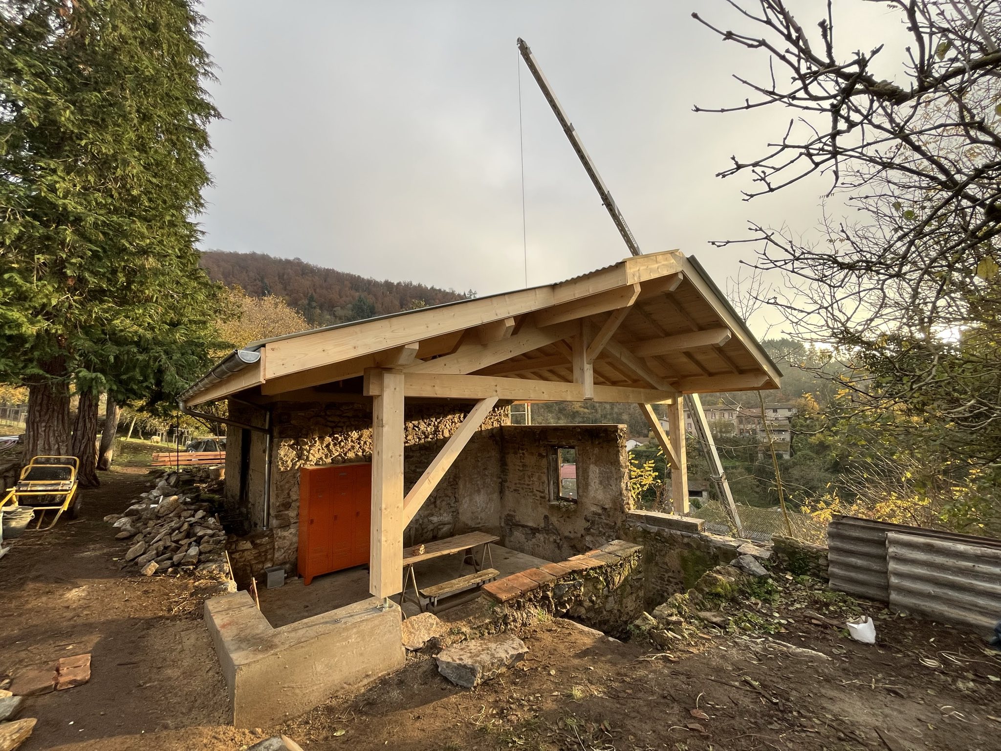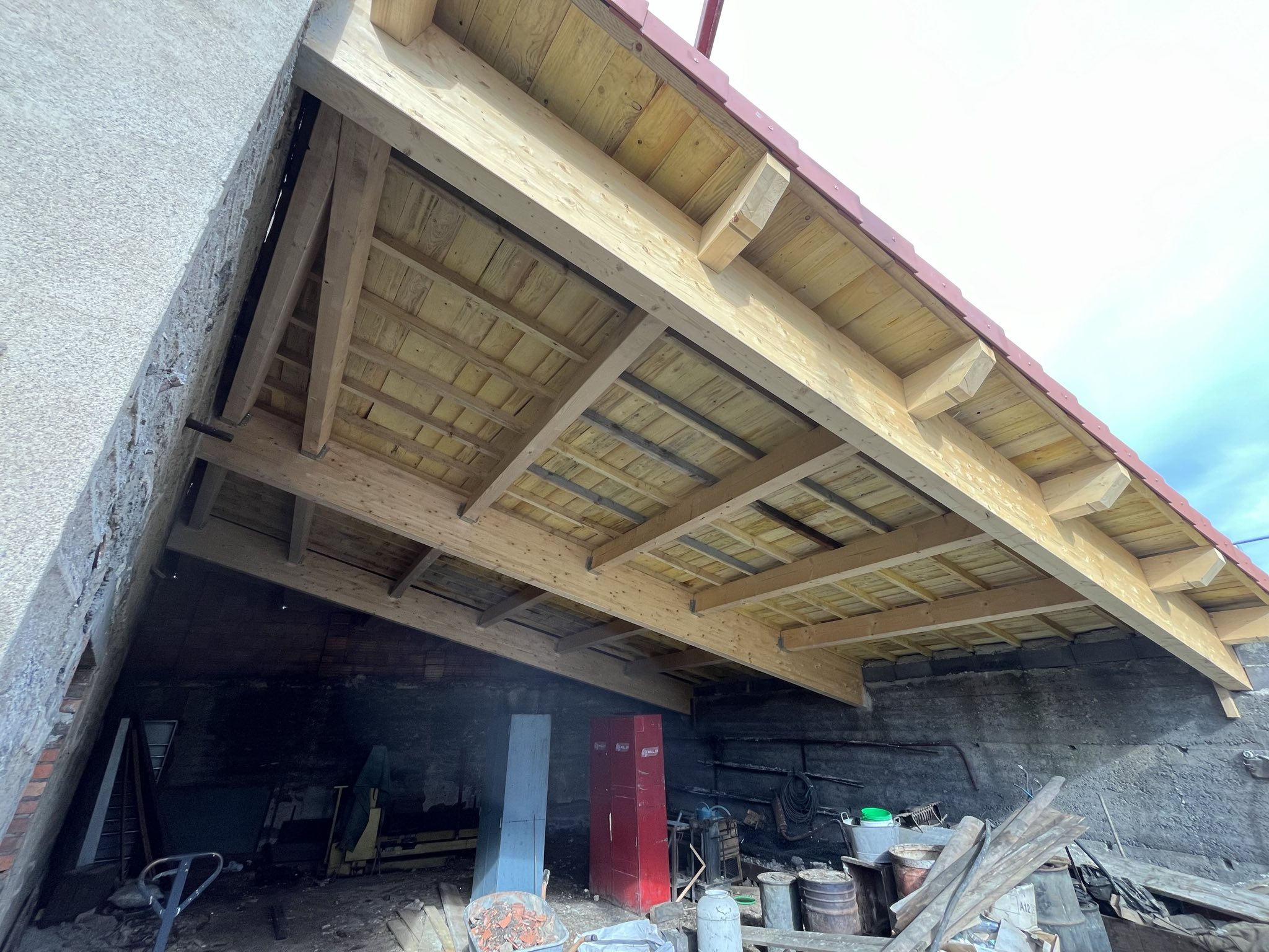 Réfection de la charpente et de la couverture de cette ancienne en pierres. La suppression des fermes pour faire place à des Lamellés collés cintré a été décidé par nous et le client, afin d’avoir une meilleur hauteur de passage sur les planchers de l’étage. Et puis, quand même, c’est sacrément beau ! Finition avec une couverture acier des deux partie en translucide en guise de puits de lumière.