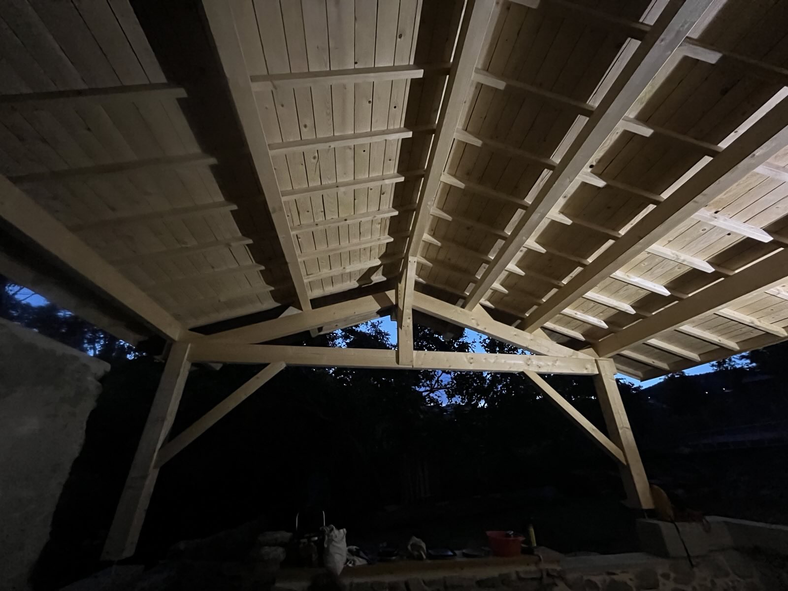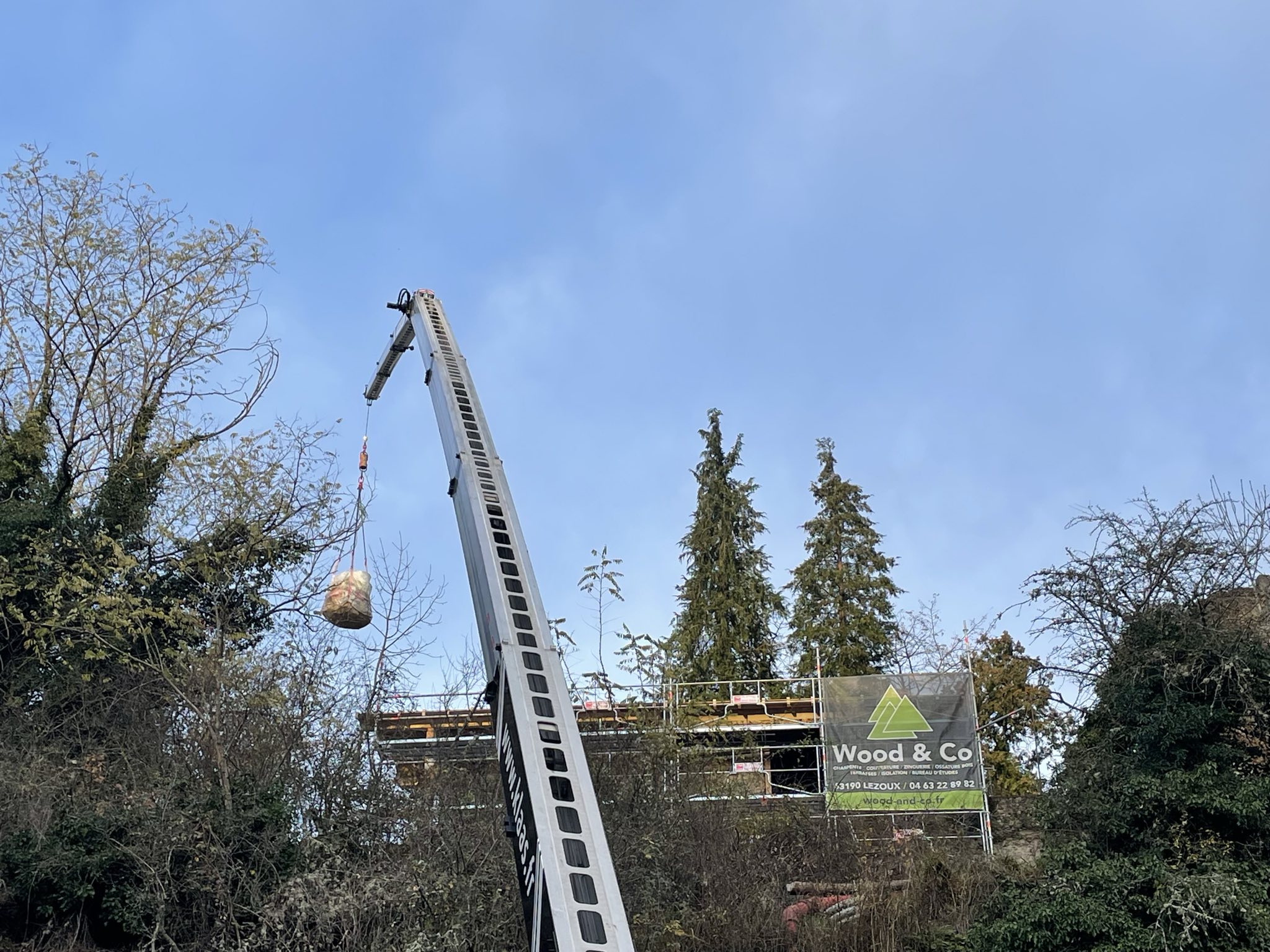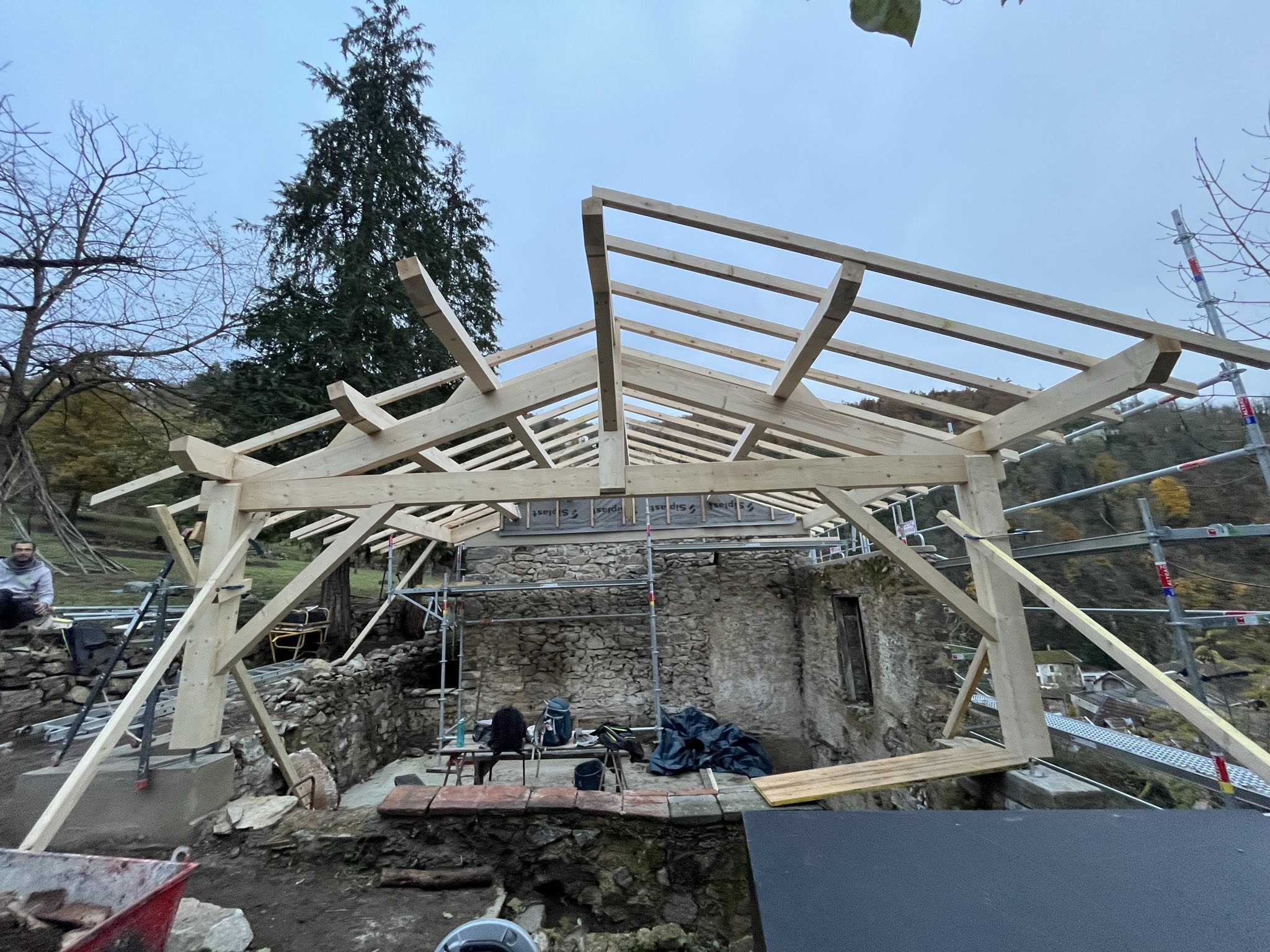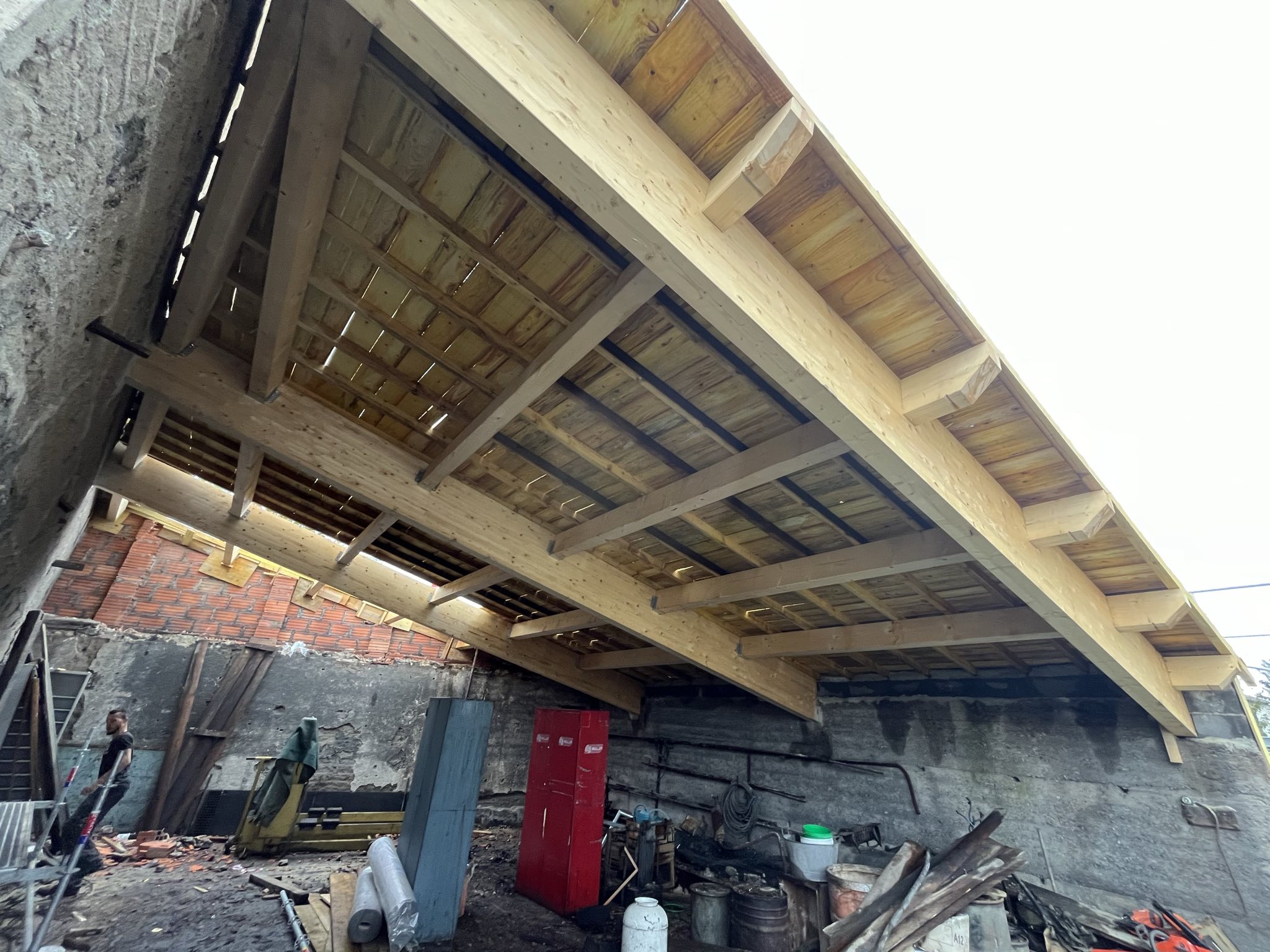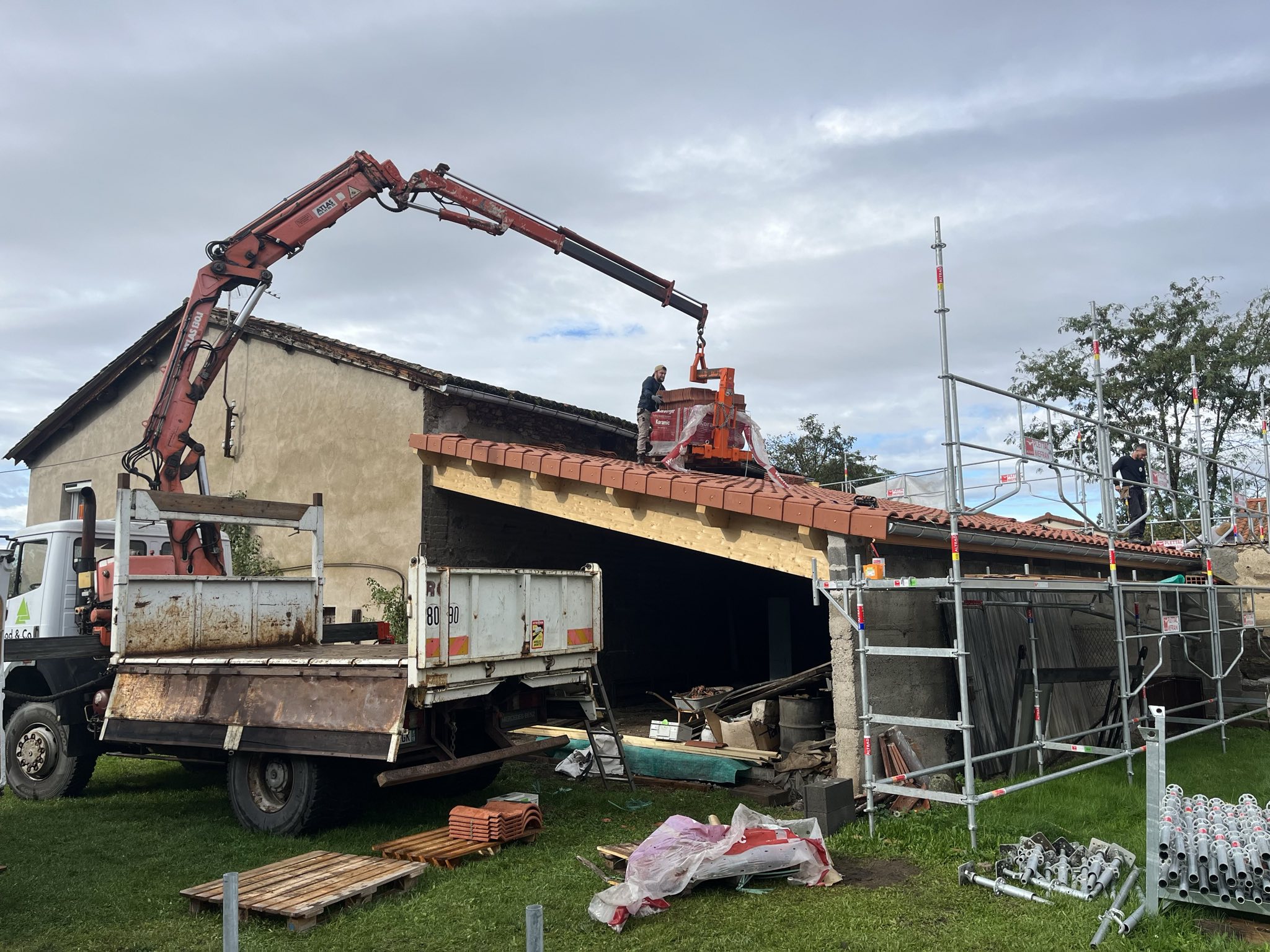 Réfection de la charpente et de la couverture de cette ancienne en pierres. La suppression des fermes pour faire place à des Lamellés collés cintré a été décidé par nous et le client, afin d’avoir une meilleur hauteur de passage sur les planchers de l’étage. Et puis, quand même, c’est sacrément beau ! Finition avec une couverture acier des deux partie en translucide en guise de puits de lumière.